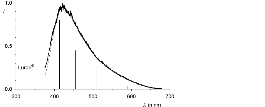 The Fluorescence spectrum of Luran® in the visible (>400 nm) is perfectly described by means of four Gaussian bands; see Figure 5. Thus, 12 parameters (see Table 2) are sufficient for the complete description of the broad spectrum and require minimal 12 values [15] of fluorescence intensity at different wavelengths.