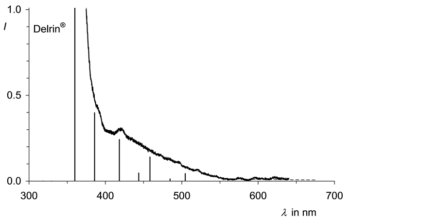 The behaviour of Delrin® is slightly different because of strong fluorescence in the UV close to the visible where five bands concern the visible and one or two bands in the UV should be considered because of tailing into the visible; see Figure 7.