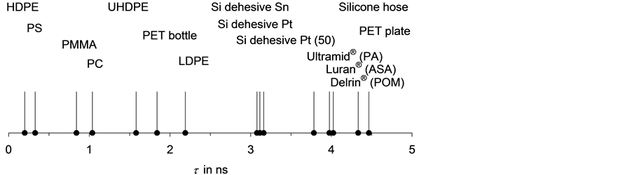 Here we see that there is a broad range of τ between 0.2 until 5 ns where the individual time constants are as characteristic as fingerprints. Remarkably, the chemically very similar and otherwise difficult to discriminate types of polyethylene, LDPE (low-density polyethylene), HDPE (high-density polyethylene) and UHDPE (ultra- high-density polyethylene) can be unambiguously distinguished; this may be a consequence of different microscopic rigidities of these materials. Moreover, different methods of manufacturing such as PET for bottles and for PET plates or different types of silicones can be well categorized; see Figure 1. The various types of silicone dehesives result in well distinguishable, however similar lifetimes τ. The availability of a further criterion for characterization would be of interest.