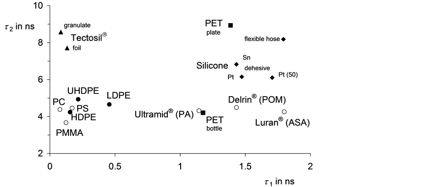 Figure 2. Two-dimensional characterization of polymers by means of their constants τ1 and τ2 of bi-exponential data processing of fluorescence decay. Filled circles: The polyethylenes LDPE, HDPE and UHDPE; squares: PET; diamonds: Silicones; triangles: The silicone elastomer Tectosilâ.
