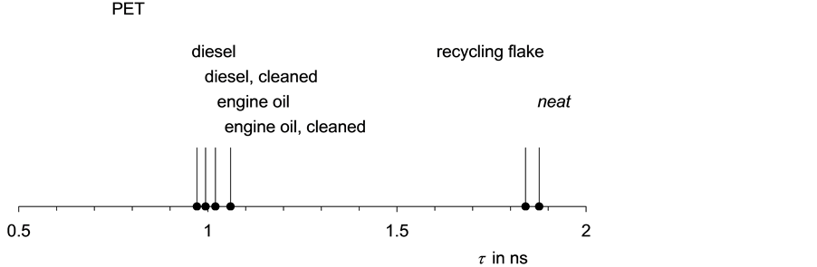 Figure 3 clearly indicates that a pre-treatment of PET results in a lowering of the fluorescence lifetime τ. This is most pronounced for diesel with low molecular weight and low viscosity and slightly less pronounced for engine oil with higher molecular weight and viscosity; this corresponds to observations with silicone dehesives and Tectosilâ (see Figure 2). A technical cleaning of the contaminated PET increases the fluorescence lifetime again, however, it does not reach the high value of the neat material by far. Even clean commercial recycling flakes exhibit a slightly diminished fluorescence lifetime.