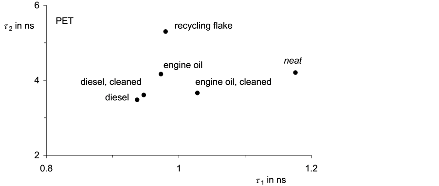 The detection of contaminations becomes more extended by means of the two-dimensional presentation of the fluorescence lifetimes τ1 and τ2 in Figure 4. The recycling flake with τ close to the neat material given in Figure 3 becomes much more separated by τ1 and τ2 in Figure 4. The alterations by means of purifying exhibit different effects for diesel and engine oil. As a consequence, neat material can be well separated.