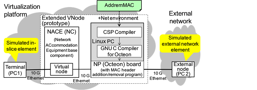 As shown in Figure 4, the above program was used in an extended VNode, which is a gateway between slices and external networks and is called NACE or NC [17] . This network consists of the VNode and two personal computers, PC1 and PC2. PC1 simulates a terminal or a virtual node in a slice. PC2 is in an external physical network. The VNode connects the slice and the external network, and it must convert the packet format, i.e., convert from the internal to external protocols, and vice versa, but the base component of the VNode does not have this conversion function. The VNode is experimentally extended by the node plug-in architecture with the