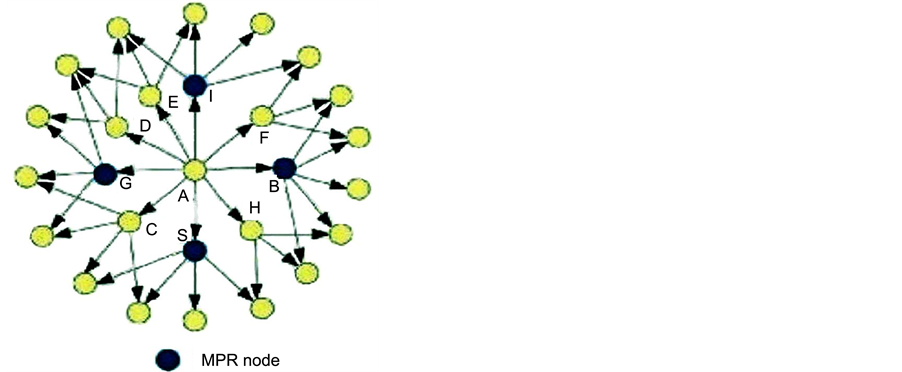 amount of traffic to be generated, which may take up network resources and reduce the performance of the network. Multi Point Rely (MPR) is a unique feature of MPR that is able to minimize the number of rebroadcasting nodes and, in turn, reduce the number of control messages generated during an update. With MPR, nodes are able to exchange topological information in a periodical manner without having to generate a large amount of traffic [6] . Figure 2 shows how update messages are transmitted with the use of MPR. Notice that the updated messages are only forwarded via selected nodes [8] . A route, from the given source to the destination is also created by the MPR. The process of neighbor detection is carried out by the periodical broadcast of HELLO messages by each node that are linked. These nodes sense each other, and in cases of symmetrical links, will regard each other as neighbors. Furthermore, link sensing and MPR selection process can also be carried out by the HELLO messages. All information pertaining to the relevant node that sent the HELLO message and its neighboring node will be found in the HELLO message. Each node is updated and recalculated when the updated information is received [9] . The TC message broadcasts topological information throughout the network, but these messages are only forwarded through MPR nodes. The MPR strategy functions better in large networks, which also positions OLSR as a better choice for large and dense networks.