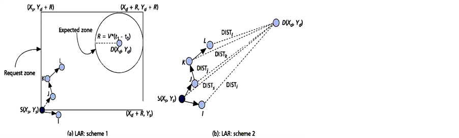 The location aided routing protocol fails to confirm a location-based routing protocol and proposed the usage of position information to improve the route discovery phase of reactive ad-hoc routing approaches. The location information is obtained by GPS by utilizing two flooding regions; forwarded and expected. The decrease in the search space will inevitably result in lesser route messages. When a source node intends to dispatch a data packet, it will first request for the location of the destination from the location service which causes contacting and tracking problems [42] . Figure 4 as shown in the two LAR algorithms being proposed; LAR Scheme 1 and LAR Scheme 2 [43] . LAR Scheme 1 utilizes the expected location of the destination to confirm the requested zone during route discovery. The requested zone is rectangular both at the source and at the expected zone of destination. Its sides are parallel to both the x and y-axis. In route discovery phase, source transmits the route request message including four corners of the requested zone and an intermediate node decides whether to transmit the message or not. Using the position from scheme LAR, Scheme 2 uses distance to define the requested zone. The intermediate node transmits if it is adjacent to the destination’s previous location than the node transmitting the request packet; it is repeated until it is not received by its intended recipient [4] [44] .