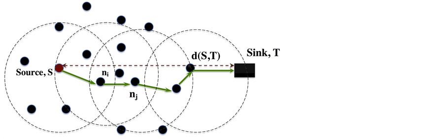 The required propagation speed in a link depends on the deadline. The deadline may be specified by the user or estimated by the source node of the event area. In Figure 5, ni is a forwarding node of the source S. Similarly, nj is a forwarding node for the node ni, where i ≠ j. Let d(ni, nj) represents the distance between node ni and nj. The source node S calculates the required end-to-end propagation speed Velreq to the sink T, as Velreq = d(S,T)/tset with respect to the estimated deadline tset. It selects one of its neighbor node as a forwarding node if the provided propagation speed Velprov, of data packets on that link (i.e. source and the neighbor node) is greater than or equal to the required propagation speed Velreq along with the fulfillment of other conditions as stated above. In the process of sending the packet from source to sink every forwarding node computes the required and provided propagation speeds as shown below.