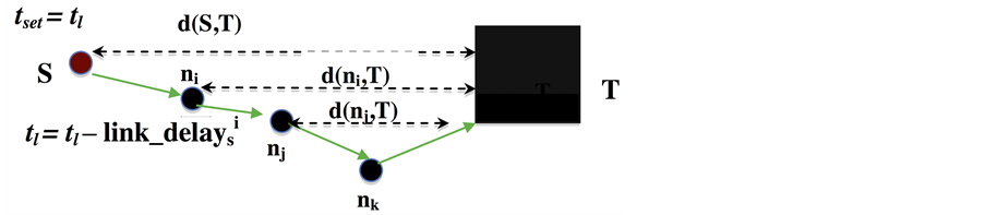tl: Time left to meet deadline. At the source node, S, tl, is equal to tset and in every forwarding node tl is updated.