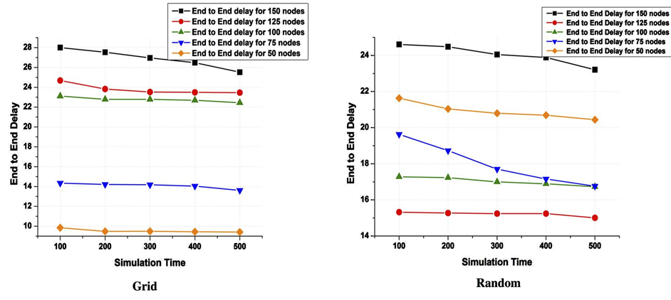 It is observed that end to delay decreases with increase of simulation time for both grid and random deployment of sensor nodes. For grid deployment, we can see that end to end delay is decreasing uniformly with the