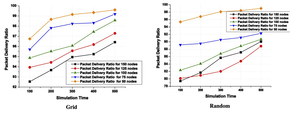 Figure 8. Packet delivery ratio vs simulation time (seconds) for grid and random deployment.
