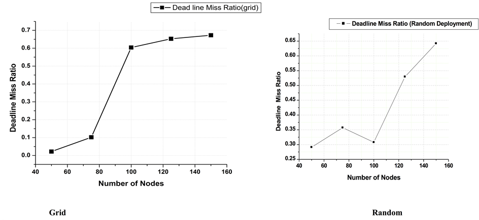 Figure 9. Deadline miss ratio vs number of nodes for grid and random deployment.