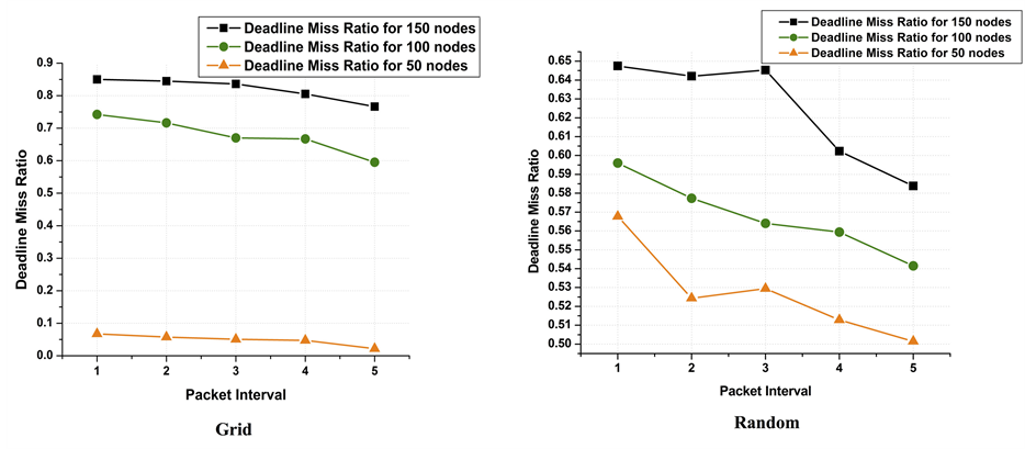 intervals of 1 second, 2 seconds, 3 seconds, 4 seconds and 5 seconds. The number of sensor nodes varied as 50, 100 and 150. Here also deadline is 19 milli seconds and simulation time is 500 seconds. It is observed from the graphs shown in Figure 10 that Deadline Miss Ratio decreases with respect to increase of packet interval for both grid and random deployment of sensor nodes.