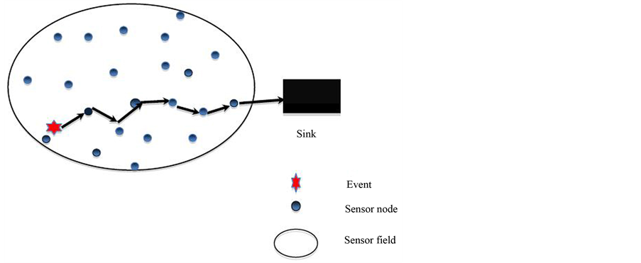 WSNs are collection of large number of sensor nodes deployed for sensing and gathering data [1] . This gathered data are sent to a control station called sink or base station for further processing. Different applications in which WSNs can be deployed are environment sensing, health care, surveillance, industrial control, home automation, security services, etc. [2] . A simple wireless sensor network model is shown in Figure 1, redrawn from [3] .