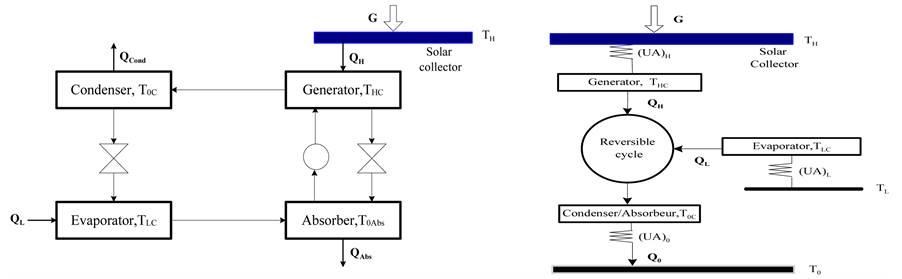 The solar driven absorption refrigeration cycle and its equivalent model are shown in Figure 1(a) and Figure 1(b). The cycle is considered to be endoreversible, i.e. internally reversible and externally irreversible. Internal irreversibilities are assumed negligible in presence of the heat exchange irreversibilities due to finite temperature differences. Internal irreversibilities due to heat transfer, throttling, mixing and internal dissipation of the working fluid, which are responsible for the entropy generation are always present in a real heat driven refrigerator [4] .
