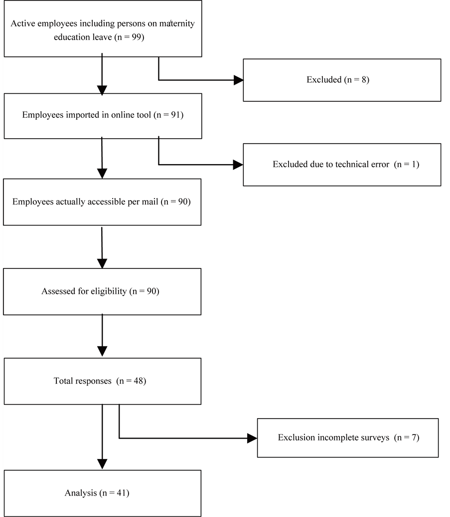 The UAS for Health Professions Upper Austria was founded in 2010 and is the youngest UAS in Austria. It is a small organisation, in sum there are 100 permanent employees (state January 2016), a lot of them (68%) are part-time. For the online survey the UAS’ for Health Professions Upper Austria permanent staff were eligible without any further inclusion and exclusion criteria. Teaching staff as well as other personnel were included because experience showed also interest of the administration employees in JCs. Part-time lecturers from outside were excluded because in a first step feasibility should be established. The sampling frame was the current employees list in January 2016, all of whom could be contacted by their official e-mail address. Persons on maternity leave were included, although it must be considered that they are not using their official address during this period. Various employees fill different positions and have therefore more than one e-mail-address: this was reduced to a single contact. Eight persons had to be excluded because of potential bias. These were members of the worker’s council or the management, who had insight into the questionnaire during development, as well as the research team. The participant’s flow chart can be seen in Figure 1. Participation was voluntary and consent was assumed when participants delivered their completed questionnaires. No incentives were offered.