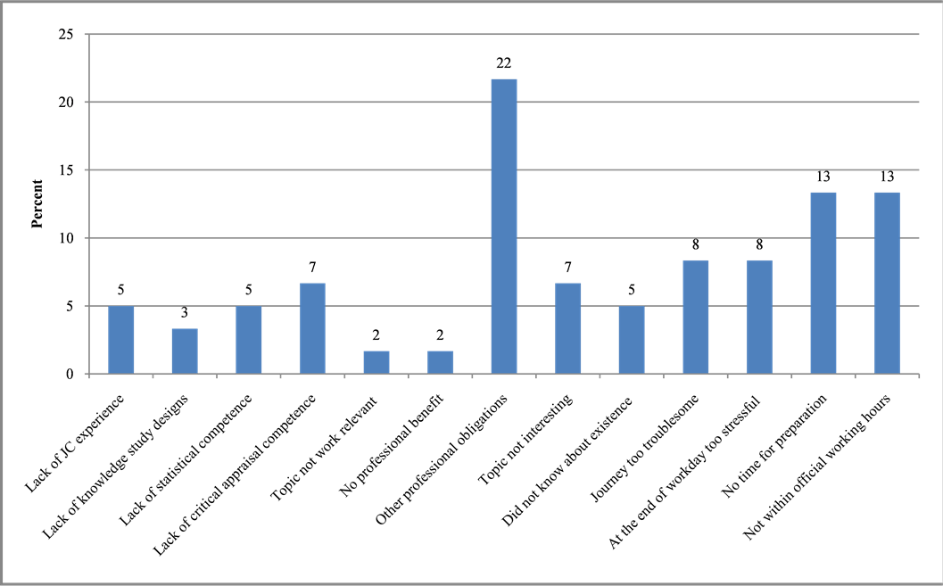 The main reason (22%) for not taking part in previous JCs was “other professional obligations”, as has also been pointed out previously by Aiello-Laws (2010) , and this will remain a challenge. The next two most-chosen answers in this survey (“no time for preparation”, “not in my regular work hours”) were classified as substantial barriers. Better information for participants in advance that preparation (reading the paper chosen) would be favourable, but not obligatory, should be considered. Aiello-Laws et al. (2010) estimated that only 20% read the paper in advance and advocated five minutes scanning the selected article at the beginning of the JC meeting. Maybe reading the abstract would also be sufficient and a short resume could be given by the moderator in a structured way (Dadabhai & Lowther, n.d.) . Emphasis should here be lain on the clinical question (Khabbazi et al., 2013) which instigated the search at the beginning.