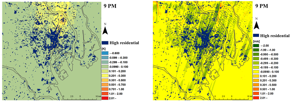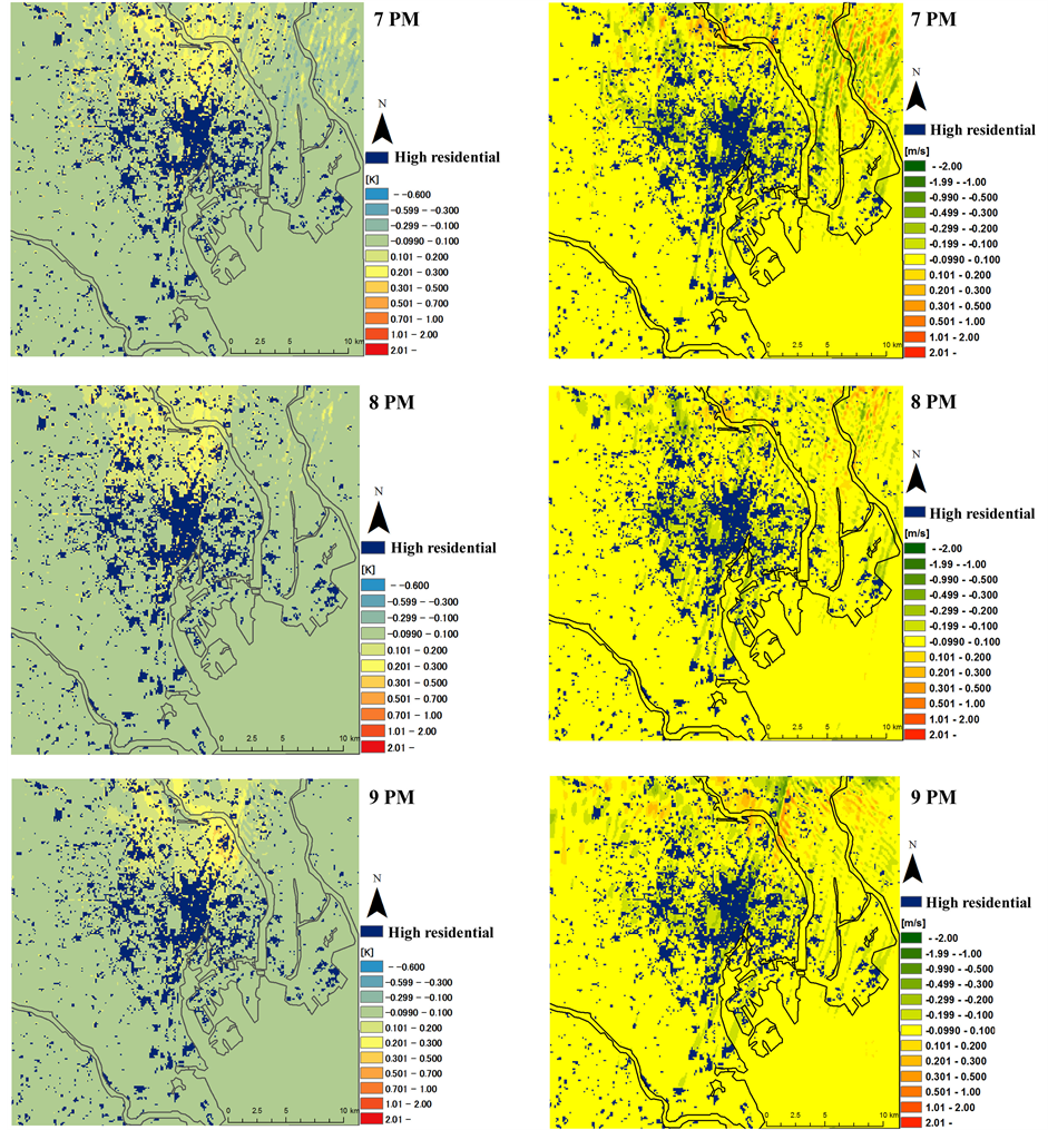 Figure 5. Temperature differences (left side) and wind speed differences (right side) between Scenarios 1 and 2 from 7 PM to 9 PM.