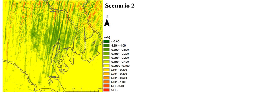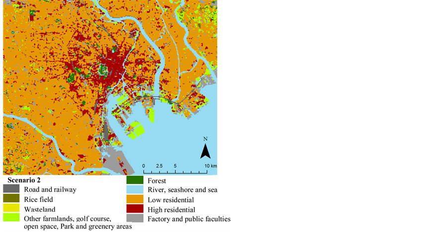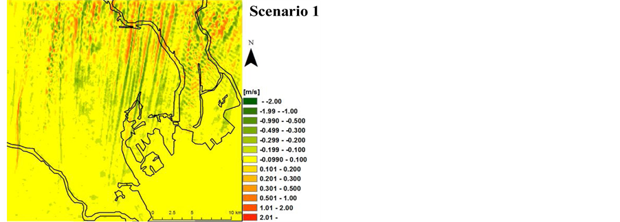 Further, in order to compare the simulation results of Scenarios 1 and 2, differences in temperature and wind speed between Scenarios 1 and 2 were also found for each 1 km interval grid cell. As in studies by Taniguchi et al. (2008) [5] and Junimura et al. (2008) [6] , the difference in wind speed was derived as a scalar quantity.