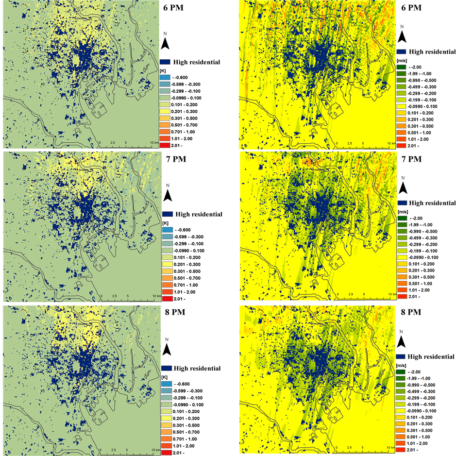 Figure 7. Temperature differences (left side) and wind speed differences (right side) between Scenarios 1 and 2 from 6 M to 9 PM.