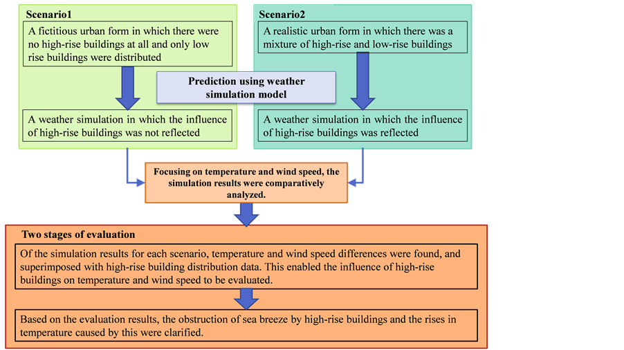 In this study evaluation was conducted in two stages, according to the flow shown in Figure 1. Firstly, two scenarios which imagined different urban forms―one with high-rise buildings and the other without high-rise buildings―were created. Using Scenario 1, a simulation which imagined a fictitious urban form in which there were no high-rise buildings at all and only low rise buildings were distributed was conducted, and results were obtained for a weather simulation in which the influence of high-rise buildings was not reflected. Using Scenario 2, a simulation of a realistic urban form in which there was a mixture of high-rise and low-rise buildings was conducted, and results were obtained for a weather simulation in which the influence of high-rise buildings was reflected. Next, the simulation results for the two scenarios were comparatively analyzed.
