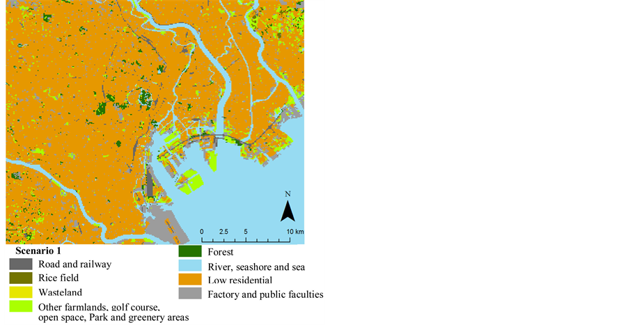 (1) There are 27 categories of land use in the WRF; however, the above-mentioned urban area land use subdivided mesh data has 11 categories, and its method of classifying land use is different to that of the WRF. Therefore, with reference to Akimoto et al. (2010) [19] , the land use categories in the urban area land use subdivided mesh were made to correspond to the unique categories of the WRF, as shown in Table 1. Further, in Scenario 1, which does not divide buildings into low-rise buildings and high-rise buildings, both types of buildings were classified as “Low Intensity Residential”. In Scenario 2, which divides buildings into low-rise buildings and high-rise buildings, low-rise buildings were classified as “Low Intensity Residential”, and high-rise buildings were classified as “High Intensity Residential”. This work was performed using the ArcGIS field calculation function, and the processed land use data was output in CSV file form. Urban forms in Scenarios 1 and 2 in the region for evaluation are shown in Figure 2.