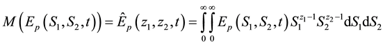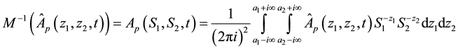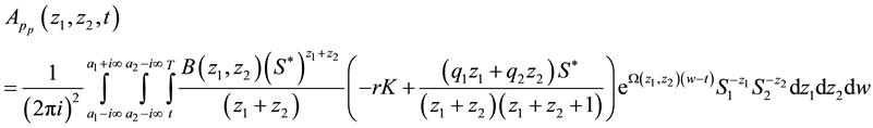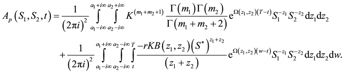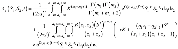 Now we consider the double Mellin transforms in order to derive the expression for the price of American put option on a basket of two stocks. American put option on a basket of two stocks gives the option’s holder the right to sell the basket stocks at any time from 0 to