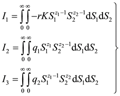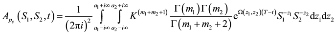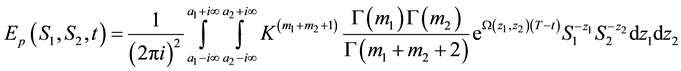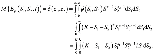 Equation (28) is the integral representation of the price of European put option on a basket of two stocks with dividend yield via the double Mellin transform method.