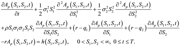 The non-homogeneous Black-Scholes partial differential equation for American put option on a basket of two stocks with dividend yield is given by