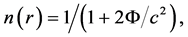 more slowly in a material medium than in vacuum, the velocity being inversely proportional to the refractive index of the medium. The phenomenon of refraction is in fact caused by the slewing of the wave-front in passing into a region of smaller velocity. We can thus imitate the gravitational effect on light precisely, if we imagine the space round the sun filled with a refracting medium which gives the appropriate velocity of light [my italics]. To give a velocity of