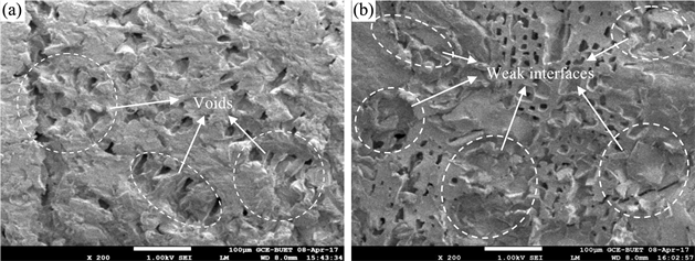 Figure 7 illustrates FESEM micrograph of the fractured surface of (a) PLAF and (b) UFPC. The surfaces of both images are not fairly smooth. The porosity of PLA increases when it is made PLAF. Besides, a lot of flaws and voids are seen on the surface of PLAF. In Figure 7(b), the image of UFPC shows lot of weak interfaces, resulting poor adhesion between fiber and matrix components. Huge pores are also found on the surface of UFPC.