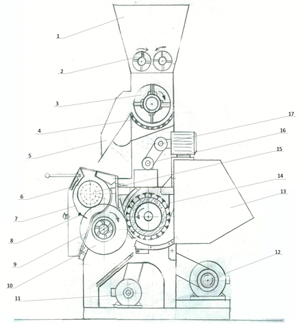 Figure 1. Scheme and appearance of the gin machine construction which can held 30 sawing experiment. 1-hopper, 2-support rollers, 3-stake drum, 4-mesh surface, 5-tray, 6-roll box, 7-apron, 8-seeds, 9-gridirons, 10-blade cylinder, 11-engines (into the brush drum), 12 engine (into the sawing a drum), 13-fiber assembly of the camera, 14-the brush drum, 15-the device mounted to the side of the working camera, 16-cycling roller of the device which mounted to the side of the working camera, 17-engine (0.75 kW working to transform the unit is set to the side of the camera).
