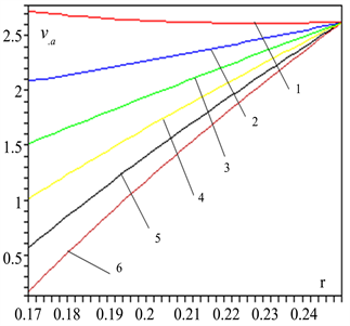 Figure 5. Seed roller exchange rate transverse, cutting radius, the demon left edge of the roll box1, z = 0; 2-z = 0.1; 3-z = 0.2; 4-z = 0.4; 5-z = 0.5; 6-z = 0.5 m accounting change principle.