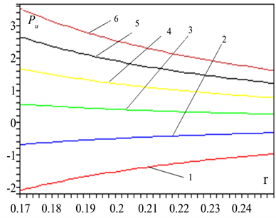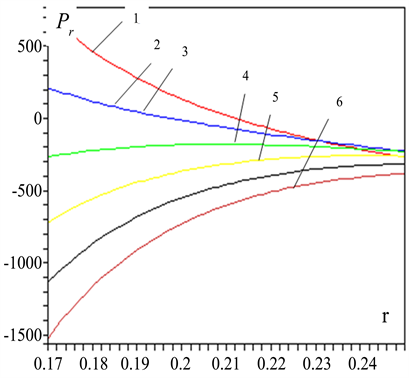 Figure 7. Seed roller sure that the power of a normal pressure, the demon left edge of the roll box1, z = 0; 2-z = 0.1; 3-z = 0.2; 4-z = 0.4; 5-z = 0.5; 6-z = 0.5 m from transverse cutting radius variation principle.