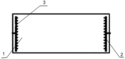 Figure 2. Scheme and appearance of the stakes installed on the side of the gin roll box (Patent FAP 00990). 1-roll box, 2-on the side of the roll box, 3-stakes.
