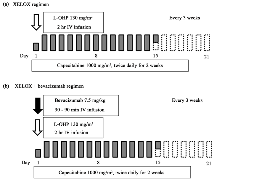 Figure 1. Chemotherapy regimens: (a) XELOX regimen; (b) XELOX + bevacizumab regimen.