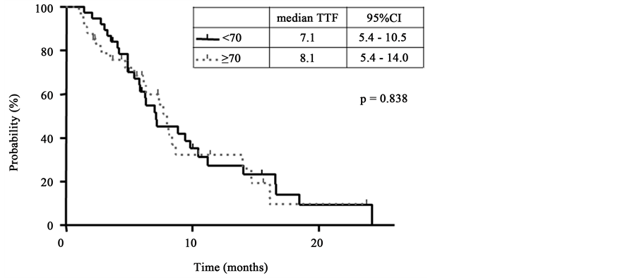 Figure 3. Kaplan-Meier curves of the TTF in the XELOX group. The median TTF was 2.8 months and 3.2 months in the non-elderly group ( ) and elderly group ( ), respectively.