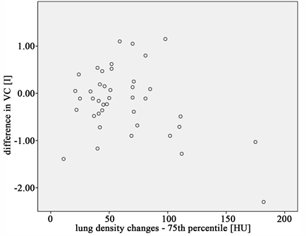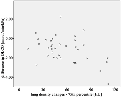 correlation is questionable. The problem with both the minimum and maximum density change is that these might be isolated values which do not necessarily represent the overall change in lung density like e.g. the mean or median density change. Therefore they can easily be outliers due to an extreme density change in a volume that might only be the size of a voxel. It is highly unlikely that a volume this size would have any influence on a patient’s PFT, especially the TLC. Furthermore no lung density parameter that represents a larger amount of voxels like the mean, median or any other percentile proved to have any significant correlation 12 weeks after treatment. However 6 months after treatment both the DLCO and the VC show a number of significant correlations with several lung density parameters. At 6 months after RT the predominant toxicity is the radiation-induced lung fibrosis whereas the radiation pneumonitis (RP) as the most common radiation induced lung toxicity is more likely to occur in the first 3 months after RT [10] [20] - [26] . A fibrotic remodeling of lung tissue leads to an increase in lung density, which can be detected in follow-up CT scans [1] [10] [13] . The DLCO as a diffusion parameter is more sensitive in reflecting RT induced changes in lung tissue [1] - [7] [26] [27] . It is also the PFT parameter that is commonly reported to show a stable decline after RT [1] [2] [3] [7] [26] [27] . Therefore it is not surprising that there are 5 significant correlations between the DLCO and lung density parameters. The correlation coefficients however are not large, but with −0.370 to −0.478 larger that those reported by Ma et al. with a correlation coefficient ranging from 0.17 to 0.29 [28] .