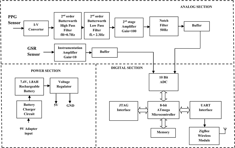 It consists of Instrumentation and Conditioning circuit for the PPG and GSR signals. The PPG sensor uses a red light source operating at a wavelength of 670 nm with 3 mw power. The output of the photodetector is fed to an I-V converter and signals are band limited to 0.5 - 20 Hz using a 2nd order Butterworth filter. The signals are further amplified using a amplifier (INA128) with a gain of 20.