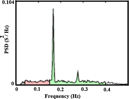 Table 6 illustrates the frequency domain parameters of HRV and the output gives the information about power distribution of spectral components obtained from RR intervals, the ULF, VLF, LF and HF measured are 0.003, 0.003 - 0.04, 0.04 - 0.15, 0.15 - 0.4 Hz respectively.