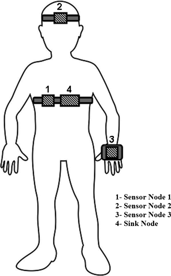 The proposed wireless wearable physiological monitoring system consists of three sensors nodes placed strategically at specific locations on the human body to acquire the physiological parameters. Figure 1 illustrates the schematic of the WBAN consisting of three sensor nodes.