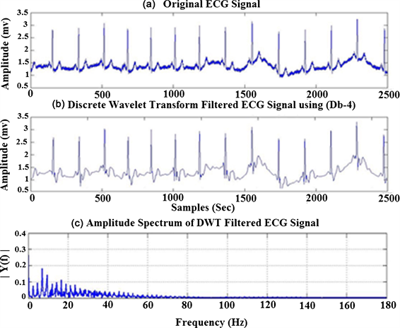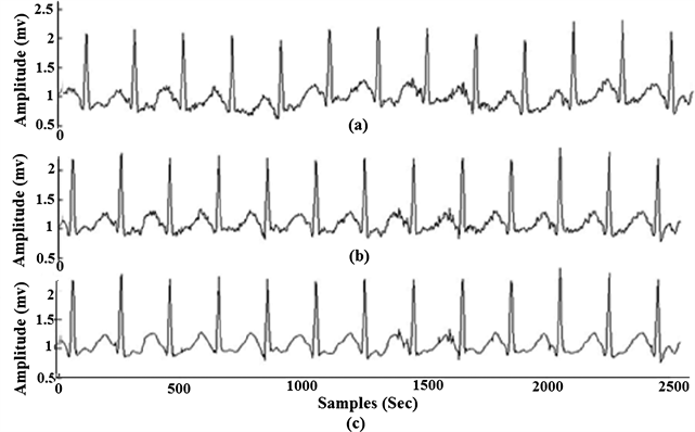 Figure 17. ECG Signal acquired from Node-1, (a) raw ECG signal (b) baseline wander removed (c) tremor removed ECG signal.