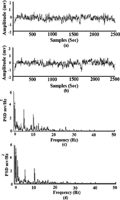 Figure 18. EEG Signal acquired from fp1-fp2 during the normal activity of the subject acquired from sensor Node-2 (a) from conventional Ag-AgCl electrode (b) dry textile electrode (c) Power Spectral Density (PSD) of Ag-AgCl electrode (d) Power Spectral density (PSD) of textile electrode.