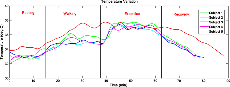 From the GSR recordings it is evident the GSR is low when the subjects are relaxed and the conductance increases while they performed mathematical operations. The skin temperature recordings from five subjects while performing predetermined tasks such as resting, walking, exercise and recovery are shown in Figure 20.