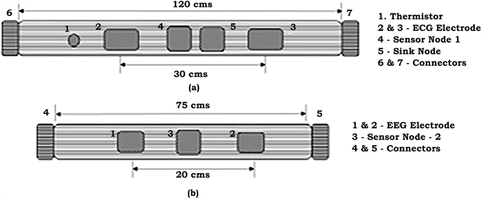 The ECG and EEG electrodes were fabricated with the conductive textiles of length 30 mm and width 25 mm and the connector was made at one edge of the electrode using a stainless steel connector. The electrodes were fabricated for the acquisition of ECG Lead-I and EEG signal from the frontal pole region. The GSR electrodes were also fabricated with conductive textile material of length 15 mm and width 10 mm and the connectors were made using stainless steel. Figure 2(a) illustrates the schematic of the sensor node integrated into a chest belt with ECG electrodes, temperature sensor and the wearable data acquisition hardware and Figure 2(b) illustrates the schematic of the sensor node, integrated with EEG electrodes to acquire from the frontal pole region.