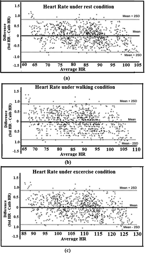 The bias and precision for heart rate recorded from the developed wearable systems and standard measurement method while the subjects were performing the routine activity of resting, walking and mild exercise are measured. The bias for heart rate measured during resting, walking and mild exercise was 0.0028, 0.00035 & −0.000056 respectively. The precision for heart rate measured during resting, walking and mild exercise was 0.8231, 0.9325 & 0.9272 bpm respectively. The Bland-Altman plots for heart rate while resting, walking and mild exercise are illustrated in Figure 21(a), Figure 21(b) and Figure 21(c) respectively.