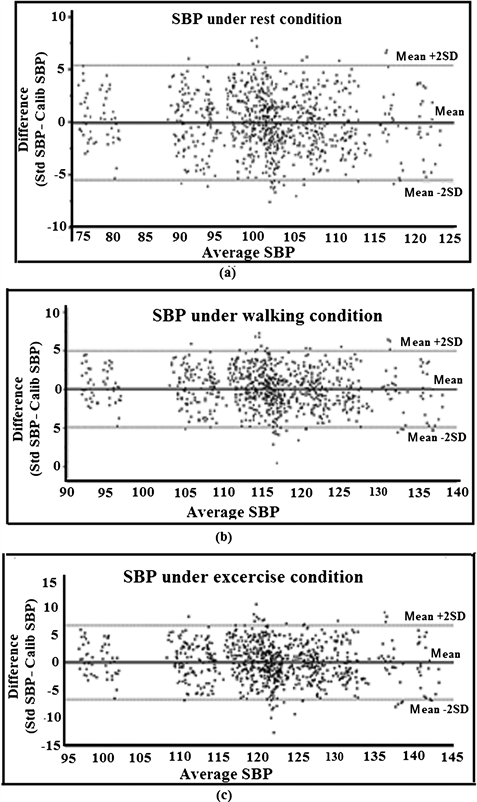 standard measurement method while the subjects were performing the routine activity of resting, walking and mild exercise are measured. The bias for systolic blood pressure measured during resting, walking and mild exercise was −0.00045, 0.00024 & 0.00024 respectively. The precision for systolic blood pressure measured during resting, walking and mild exercise was 5.8123, 5.1233 & 6.8934 respectively.