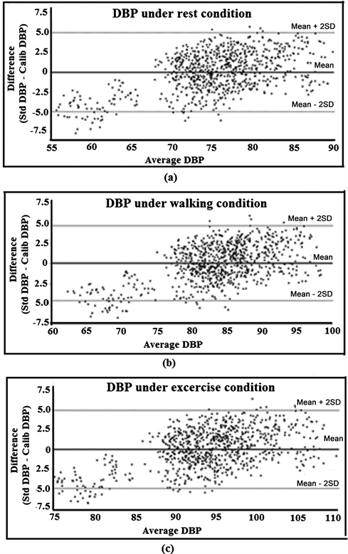 and standard measurement method while the subjects were performing the routine activity of resting, walking and mild exercise are measured. The bias for diastolic blood pressure measured during resting, walking and mild exercise was 0.00012, 0.00341 & 0.00014 respectively. The precision for diastolic blood pressure measured during resting, walking and mild exercise was 4.9756, 4.8745 & 4.9945 respectively. The accuracy of the system is within the limits of IEEE Standard of (5 ± 8 mmHg).