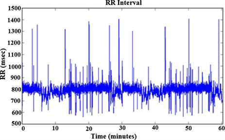 Figure 24(a) illustrates the time domain plot of the R-R intervals for 1-hour duration of heart rate