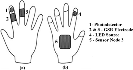Figure 3 illustrates the schematic of the sensor node, which is worn in the form of a gloves with integrated with textile electrodes for GSR measurement and PPG acquisition with source and photo detector integrated into the gloves.