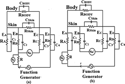 From Figure 4(a), The [RA||C1], [RB||C2], [RC||C3], [RD||C4] represents the resistance & capacitance combination of the Electrodes. Rskin & Rbody representing the skin and the body resistance.