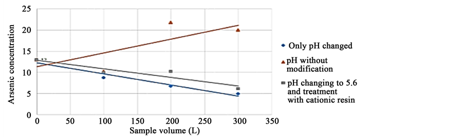 Figure 6. Comparison of water treatments at the arsenic treatment system in Bebedero, with and without modification of the pH and cationic exchange treatment.